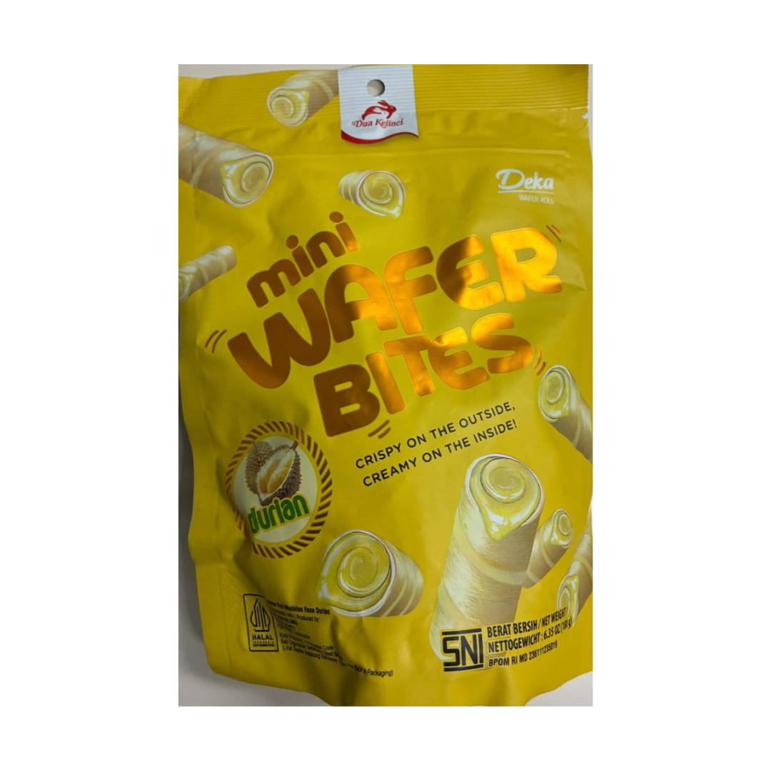 Deka Mini Wafer Bites Durian Flavor (180g or similar large pouch) is a bite-sized wafer roll snack that offers a combination of a crunchy texture and a soft cream filling. This product is popular for its distinctive and authentic durian flavor, providing a unique snacking experience.